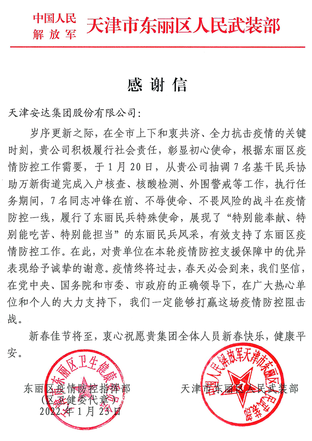 24日2022-011月19日,市疫情防控指揮部發(fā)布2022年7號通告。為切實(shí)保障人民群眾生命安全和身體健康,有力阻擊疫情進(jìn)一步擴散傳播,鞏固目前防控處置工作取得的成效,市疫情防控指揮部決定,將于1月20日6時(shí)起在全市范圍開(kāi)展第四次全員核酸檢測。我集團民兵運輸連積極響應上級單位號召,派出7位基干民兵協(xié)助萬(wàn)新街...[查看詳情]