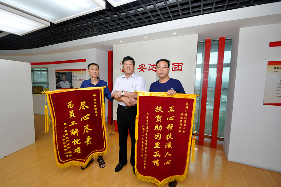 8月24日,鴻達精工機械有限公司職工桑建民、安中通訊電子有限公司職工高慶玉,作為困難職工代表來(lái)到安達集團,分別將繡有“真心幫扶暖人心,扶貧助困顯真情”,“盡心盡責,為員工解憂(yōu)難”的錦旗送到了安達集團黨委書(shū)記、董事長(cháng)崔洪金,工會(huì )主席鄭寶彥的手中,感謝安達黨委、工會(huì )對他們的真心關(guān)懷和幫助。
